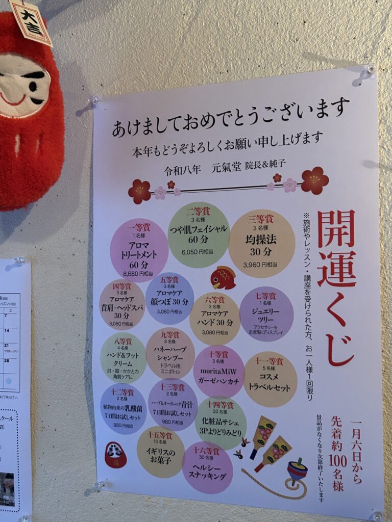 開運くじ、今年の賞品は・・・ 2026年1月7日 イベント最新情報 元氣堂の新春恒例、開運くじ! 一等 アロマトリートメント60分(8,680円相当) 1名様 二等 フェイシャル60分(6,050円相当) 3名様 三等 均操法30分(3,960円相当) 3名様 四等 首肩デコルテ・ヘッドスパのアロマタッチケア(3,080円相当) 3名様 などなど、豪華賞品がもりだくさん。 他にコスメや雑貨、健康食品なども多数ご用意しております。 一等から十六等まで、先着100名様限り。 空くじなし! ぜひ、1月はお早めにご来院くださいね^^